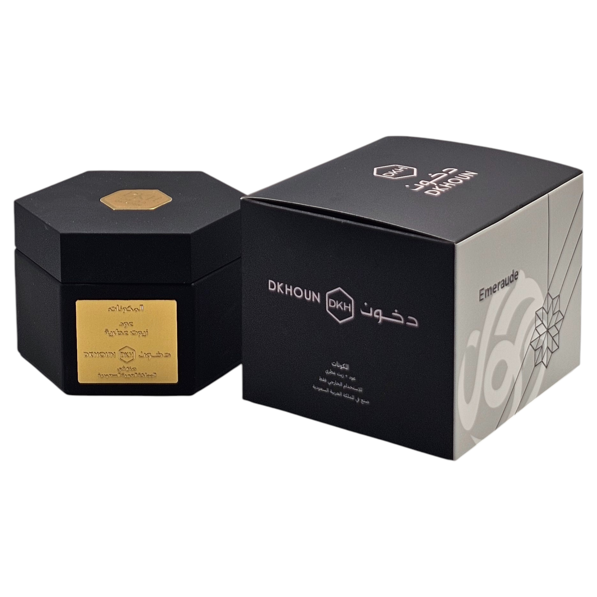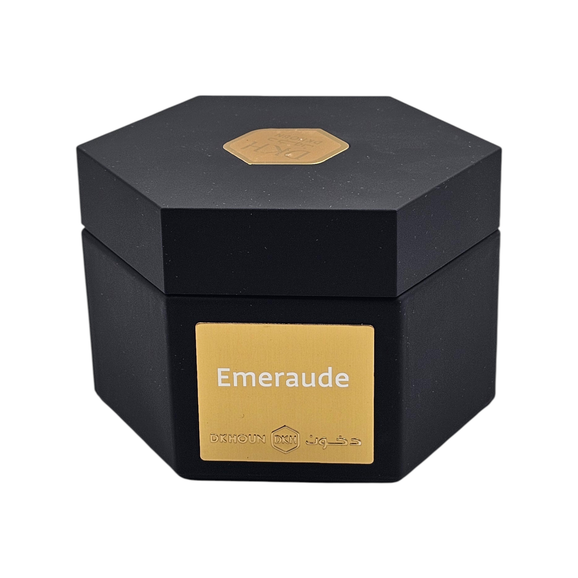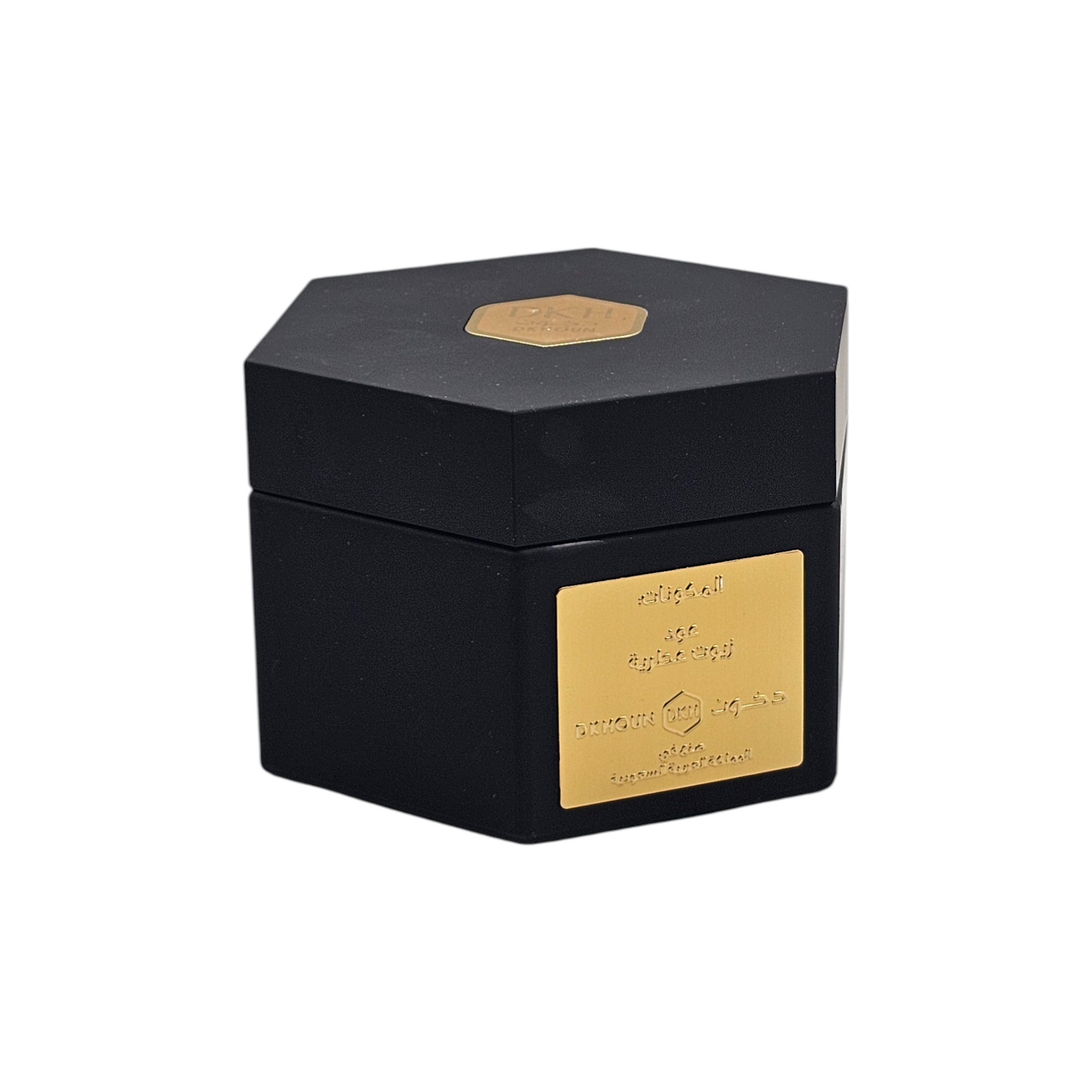 بخور يأتي في علبة سداسية أنيقة باللون الأسود المطفي، تتوسطها لمسة ذهبية تعكس هوية راقية وقوة حضور. تصميم يجمع بين البساطة والفخامة، ليكون قطعة تُعرض قبل أن تُستخدم